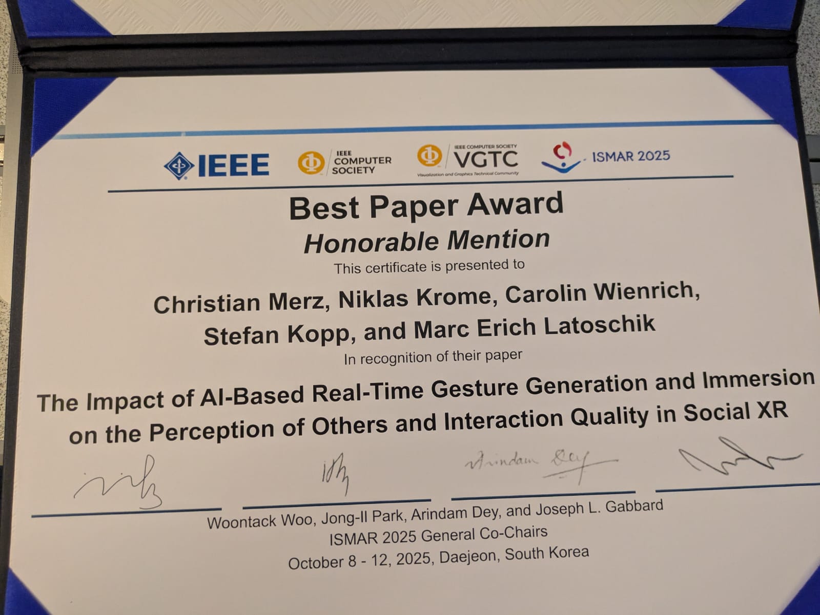 Our joint paper with colleagues from University of Würzburg on “The Impact of AI-Based Gesture Generation and Immersion on the Perception of Others and Interaction Quality in Social XR” received a Best Paper Award Honorable Mention at the 24th IEEE International Symposium on Mixed and Augmented Reality (ISMAR 2025) in Daejeon, South Korea.